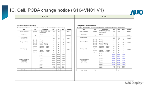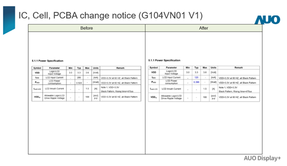 因为G104VN01 V1的IC,包括T型管IC、源极IC、栅极IC,正在向EOL移动。新的IC解决方案将应用于带有新Cell和PCBA的G104VN01 V1。